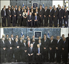 The official photo of Prime Minister Benjamin Netanyahu's new cabinet, April 1, 2009, includes two female ministers(see top photo). The Daily Advance reports that the Israeli newspaper, Yated Neeman, digitally removed ministers Limor Livnat, (on the right side of Netanyahu), and Sofa Landver, (on the left). The two women were replaced with Ariel Atias and Moshe Kachlon, respectively.(See bottom image).