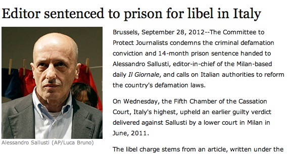 Sallusti edited the article in question, which “suggested that a juvenile court magistrate, who had allowed a 13-year-old girl the right to an abortion, should be given the death penalty” and carried an anonymous byline. As CPJ explained, “The magistrate filed a defamation complaint and a Milan court ruled that, as the editor, Sallusti bore responsibility for the publication of the anonymous article.”