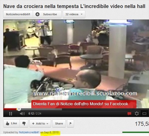 The footage in question — of “the interior of a luxury cruise ship shaking while passengers panicked” — was aired Jan. 15 as coverage of the Concordia, but turned out to be from September 2010. That cruise ship was Australian, according to Christian Science Monitor. Here is the 2010 video. (See a screenshot above this story.)