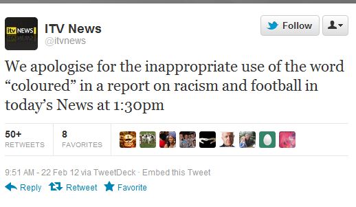 “We apologise for the inappropriate use of the word ‘coloured’ in a report on racism and football in today’s News at 1:30pm.”