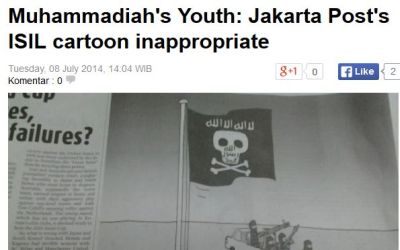 Indonesian news site Republika published the cartoon on its website, which it described as showing “a militant trying to raise a flag bearing the image of a skull and an Arabic verse ‘Laa ilaha ilallah.'”