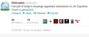 WikiLeaks tweeted today about Julian Assange's appeal. (Credit: Wikileaks, twitter)