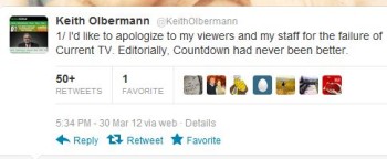 Keith Olbermann tweeted March 30 about being fired from Current TV. (Credit: Twitter, screenshot)