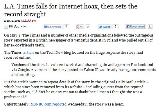 As we have written, the Los Angeles Times was one of many outlets to re-report the Daily Mail’s story that a Polish dentist yanked out all of her ex’s teeth after he broke up with her. Edgar noted that the Los Angeles Times reported that the story was a hoax in a follow-up story and also ran a correction on its original report noting that the story was a hoax..