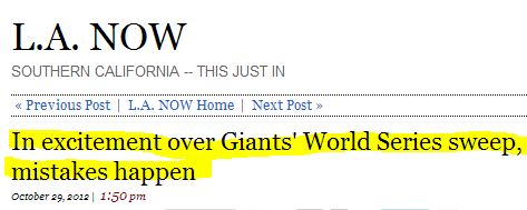 Outside of the correction, LA Times’s readers representative Deirdre Edgar pointed to the reporter of the article, San Francisco bureau chief Maria L. La Ganga‘s lengthy blog post about the error. La Ganga’s “In excitement over Giants’ World Series sweep, mistakes happen” post indicated that the error was simply because she “left my brain in San Fransisco” but explained:
