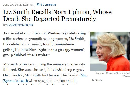Gossip columnist Liz Smith reported the death of writer Nora Ephron “hours” before it happened, the New York Times noted.