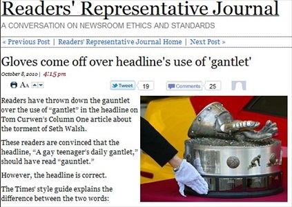 Readers wrote in “convinced that the headline…should have read ‘gauntlet,'” readers’ representative Deirdre Edgar explained.