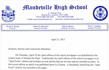 iMediaEthics has written to Mandeville High School principal Bundy, who re-directed us to Meredith Mendez, the Director of Public Information for St. Tammany Parish School System, to ask for a copy of the article in question and to ask: