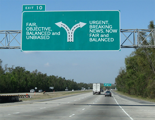 “The road signs that used to say ‘fair,’ ‘objective,’ ‘balanced and unbiased’ have been removed from a lot of the highways,” said Fred Young, former senior vice president of news for Hearst-Argyle Television. “They’ve been replaced with signs that read ‘now,’ ‘urgent,’ ‘breaking news’ and ‘fair and balanced.'”