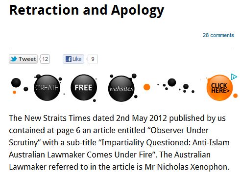 Malaysian newspaper The New Straits Times issued a substantial retraction and apology May 3 for a May 2 article headlined “Observer Under Scrutiny: Impartiality Questioned: Anti-Islam Australian lawmaker comes under fire” about Australian Senator Nicholas Xenophon.