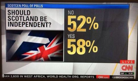 According to an image circulating Twitter, in a live broadcast hosted by CNN anchor Brooke Baldwin, CNN reported ScotCen, a Scottish social research organization, found 52% don’t want Scotland to be independent and 58% do — for a total of 110%