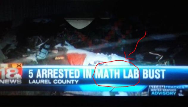 An on-air graphic from Lexington, Kentucky NBC-affiliate Lex18 reported: “5 arrested in math lab bust.”