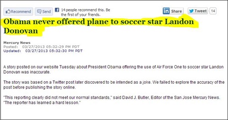 But not before The Mercury News reported on Wessel’s tweet. Making matters worse, the News didn’t include any attribution for the story, as Media Bistro’s Fishbowl DC noted. The March 26 story, “President Obama to Soccer’s Landon Donovan: Take Air Force One,” read in part: