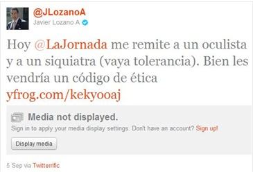 He responded Sept. 5 to those calls stating, again according to Google Translate: “Today @ LaJornada refers me to an ophthalmologist and a psychiatrist (go tolerance). Well they could use a code of ethics http://yfrog.com/kekyooaj”