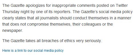The Montreal Gazette apologized to readers for “inappropriate comments posted on Twitter” by reporter Anne Sutherland. In its apology, the Gazette cited its “social media policy” guidelines, which called for its journalists to “conduct themselves in a manner that does not compromise themselves, their colleagues or the newspaper.”