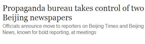 The Guardian reported that Beijing’s propaganda bureau will now be in charge of newspapers the Beijing Times and the Beijing News.