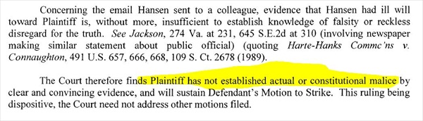 Further, the judge wrote that “the evidence is fatally void of any facts to support the premise that Hansen ever entertained serious doubts about what he wrote or implied” and that there wasn’t shown any “actual or constitutional malice by clear and convincing evidence.”