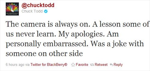 On Dec. 14’s Morning Joe program, Todd raised his middle finger to the camera. According to Mediaite and Newsbusters, it appeared Todd didn’t know the camera was live.