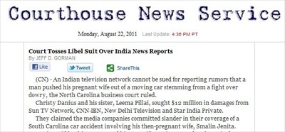 A North Carolina court dismissed a $12 million libel lawsuit against Indian TV networks Sun TV Network, CNN-IBN, New Delhi Television and Star India Private, Courthouse News Service reported.