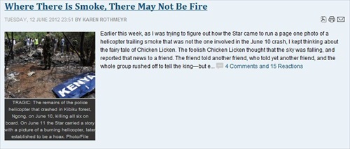 “Yesterday the Star was duped into using an Internet photo of a helicopter crashing in its story ‘Ministers Die in Horror Crash’. A reader called and said he had taken the photo of a chopper emitting smoke as he returned from Namanga. The photo was in fact of a Robinson R44 helicopter in Europe and not the AS350 Eurocopter used by the police in Kenya. We apologise for this error to all concerned.”