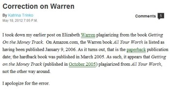 “I took down my earlier post on Elizabeth Warren plagiarizing from the book Getting On the Money Track. On Amazon.com, the Warren book All Your Worth is listed as having been published January 9, 2006. As it turns out, that is the paperback publication date; the hardback book was published in March 2005. As such, it appears that Getting on the Money Track (published in October 2005) plagiarized from All Your Worth, not the other way around.”