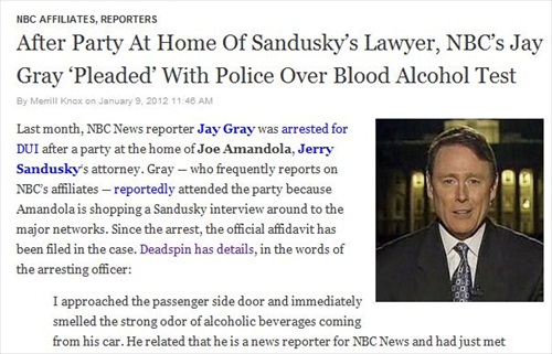 The Washington Times’ Gayle Falkenthal questioned in December the “distance reporters need to maintain from their sources” after the police charged NBC News reporter Jay Gray with driving under the influence. According to a January story by Gawker-owned blog Deadspin, which included a police affidavit, Gray told police that he had “just met with attorney Joe AMENDOLA about the Jerry SANDUSKY case.” Deadspin reported Jan. 6 that Gray has been charged with a DUI.