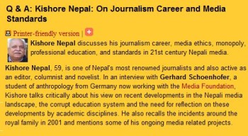 He called for “a system of guidance” in Nepal’s media to help ensure that the media is “responsible to society.” In the interview, he noted that the “guidance” should be “voluntary” and “self-imposing. He also criticized the influence of money and profit in media.