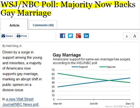The recent NBC/WSJ poll, however, did measure intensity and finds the vast majority of Americans either support or at least don’t actively oppose gay marriage.