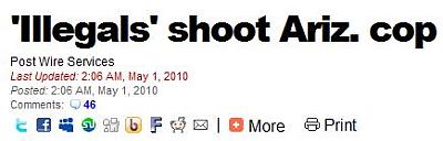 The New York Post’s headline “’Illegals’ shoot Ariz. cop” left out any cautionary language like alleged or suspected. The headline suggests that the legal status of the individuals suspected had been determined. As Oklahoma State University professor Stan Ketterer noted, journalists must be careful with language used in reporting crimes and describing people.