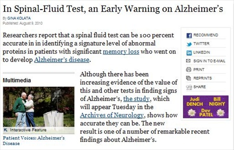 Arthur Brisbane, the new New York Times public editor, devoted his first report for the Times on an article about a spinal fluid test claiming 100% accuracy in predetermining Alzheimer’s. He originally wrote Aug 24 about the article, by Gina Kolata, expressing his concerns about the use of “absolutes.” (See StinkyJournalism’s report on the post here.)