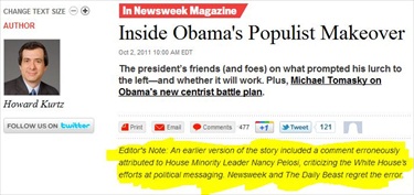 According to TPM, Newsweek attributed the error to a “misread” of “notes of an interview conducted by a colleague,” yet makes no comments on why its own high-paid reporter is unable to conduct the interview himself. At the end of the article, Daniel Stone, John Solomon, Eleanor Clift and Lois Romano are listed as having done “reporting” for the story. Too many cooks spoil the spin?!