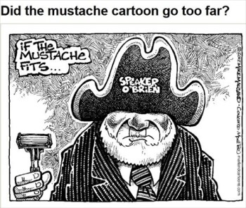 But, the saga over the Monitor’s cartoons doesn’t end there. A follow-up column by Belman reported that “people have had plenty to say about” a second Marland cartoon picturing “O’Brien with a Groucho Marx mustache.” Belman linked to a variety of sites that covered the newspaper’s cartoons including Concord Patch, TV news WMUR, Huffington Post, and the Union Leader.