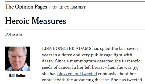 Sullivan’s column, “Readers Lash Out About Bill Keller’s Column on a Woman with Cancer,” featured a response from Keller. Keller said in part: