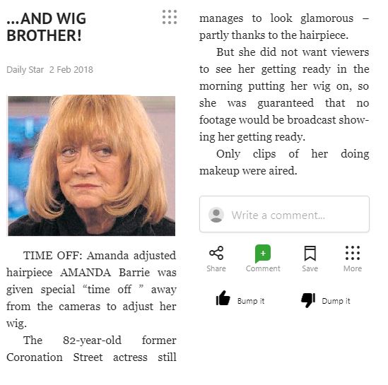 “In an article about Amanda Barrie, which was based on an article in the Daily Star, we reported that she had struck a special deal with the producers of Big Brother to ban them from showing her wig on air.