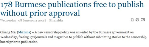 According to Mizzima, the “82 journals and 96 magazines” will now be able to publish without needing the OK from the censorship board pre-publication. Burmese news site Irrawaddy.org reported that the rest of Burmese news outlets must still be approved before publication and that the 178 uncensored publications will be reviewed post-publication.