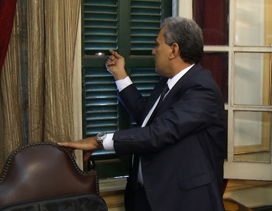 Screenshot from video interview showing bullet hole in Cairo University president’s office, Nov. 22, 2014. (Credit: iMediaEthics)