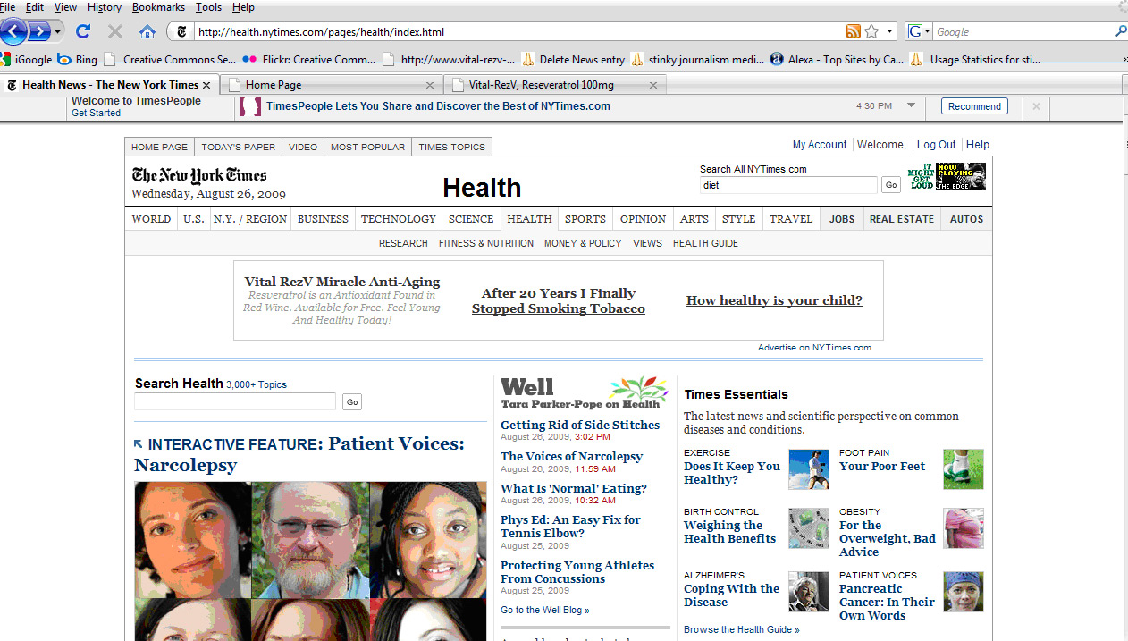 But days later (Aug 26) we found the above resveratrol banner ad living on The NY Times’ Health Section homepage. The ad for Vital RezV is selling the “Miracle Anti-Aging” antioxidant resveratrol riding off of “60 Minutes” Morley Safer’s coverage on the grape-derived product’s power.