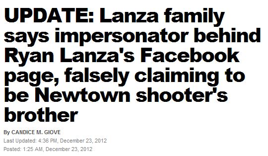 The New York Post also replaced its headline to read : “UPDATE: Lanza family says impersonator behind Ryan Lanza’s Facebook page, falsely claiming to be Newtown shooter’s brother.”