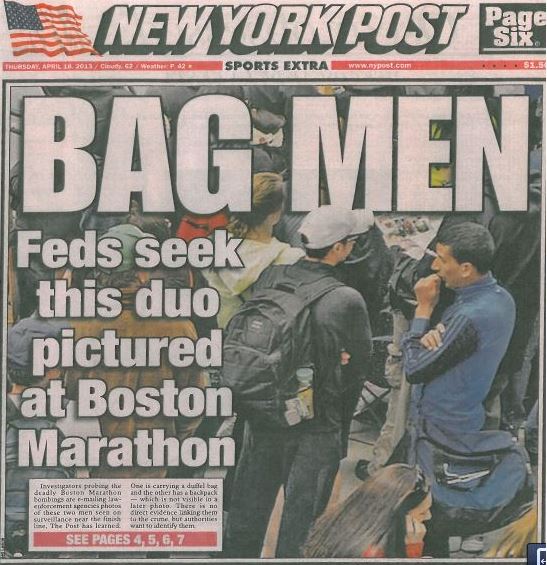 The April 18, 2013 New York Post was titled: “Bag Men: Feds seek this duo pictured at Boston Marathon” with a photo of a man with a backpack and a man with a duffel bag standing at the Boston Marathon.