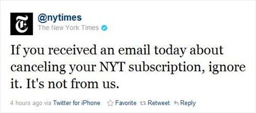 According to the Associated Press, the e-mail was intended for “a few hundred people” but ended up in 8.6 million e-mail account inboxes. In an article titled “New York Times sends out discount email by mistake, denies it, then admits error,” the AP explained that at first the New York Times said it didn’t send the e-mail. In a Dec. 28 tweet, the newspaper said “If you received an email today about canceling your NYT subscription, ignore it. It’s not from us.”