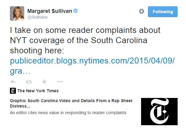 New York Times public editor Margaret Sullivan defended the Times‘ coverage of the shooting of Walter Scott.
