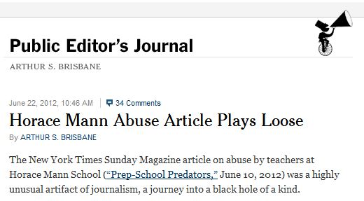 New York Times public editor Arthur Brisbane questioned the Times magazine’s June 10 article “Prep-School Predators.”