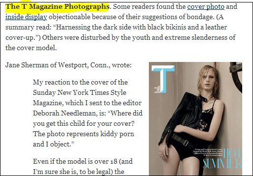 The matter is complicated, Sullivan wrote, because even though the photos in question are fashion and therefore possibly Photoshopped, newsroom staff work on the magazine and “T magazine is still a New York Times editorial product.” And other fashion sections of the paper — like Styles and the Times Magazine — don’t allow Photoshopping images outside of minimal adjustments for “color-toning and brightening,” she said.