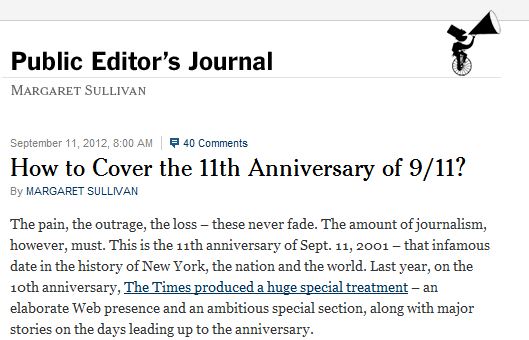 The New York Times’ new public editor Margaret Sullivan explained in a Sept. 11 blog post why the Times opted for a “far more muted” coverage of the anniversary of Sept. 11 as opposed to last year’s tenth anniversary “huge special treatment” with “an elaborate Web presence and an ambitious special section.”