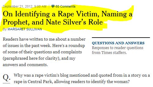 The New York Times unpublished a quote from a rape victim’s blog because it could possibly identify the woman, Times public editor Margaret Sullivan blogged Sept. 21. Sullivan explained that after a reader contacted the Times about the possible identification, the newspaper “removed” it and “that section of the story was paraphrased online and for later editions.”