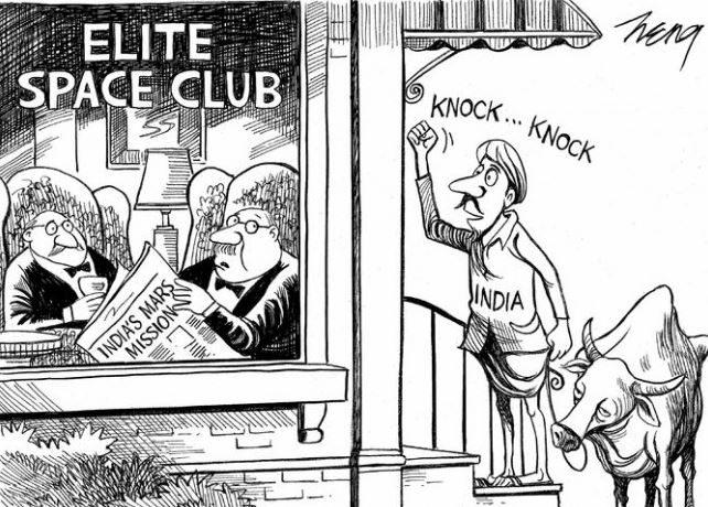 The Sept. 28 cartoon showed a mustached man labeled “India” wearing a turban. The man, holding a cow on a leash, is knocking on the door to an “Elite Space Club” where two older men are reading a newspaper carrying the headline “India’s Mars Mission.”
