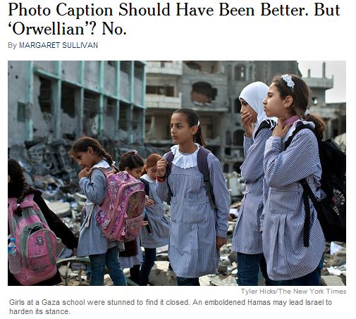 New York Times public editor Margaret Sullivan blogged that the caption accompanying the Times’ photo of Gaza school girls “could have been clearer and more informative” but wasn’t “Orwellian,” as the Nation‘s Greg Mitchell suggested.