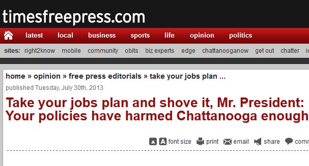 According to an Aug. 1 statement on the paper’s website, Johnson posted the following headline: “Take your jobs plan and shove it, Mr. President: Your policies have harmed Chattanooga enough.” The headline appeared on top of an editorial that “criticized the president’s job creation ideas and Chattanooga’s Smart Grid,” according to the Free Press. Obama was in Chattanooga the day the headline was posted, August 30.