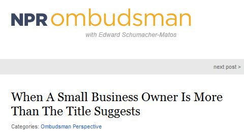 The reporter for one of the two articles, Yuki Noguchi, “declined to be interviewed” by Schumacher-Matos; Guy Raz, the host of the NPR program that aired the second report, said it was “human error” to interview the same source and that “had we known, we would have searched for another small-businessman.” Schumacher-Matos published Raz’s “full letter” in response to Schumacher-Matos’ inquiry here.