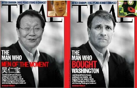 The fake cover was titled “The Man Who Men of the Moment,” wheras the original read: “The Man Who Bought Washington.” Other text on the original cover — including Abramoff’s name — appears on the fake cover. The photo is shown on Xinhua’s March 19 article. The Morning Post noted that “any copy editor with a beginner’s grasp of English would have picked up” that the cover image was phony.